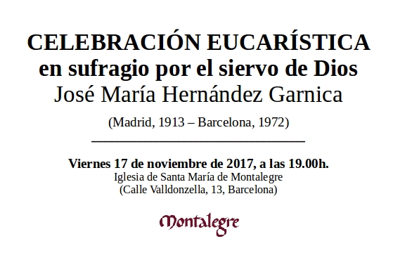 Hoy es el 108 aniversario de D. José María Hernández Garnica, que nació en Madrid el 17 de noviembre de 1913. Un buen día para leer la nueva hoja informativa que se acaba de publicar, que puedes descargar. También puedes venir a la misa que se celebrará hoy en Montalegre a las 19h, en sufragio